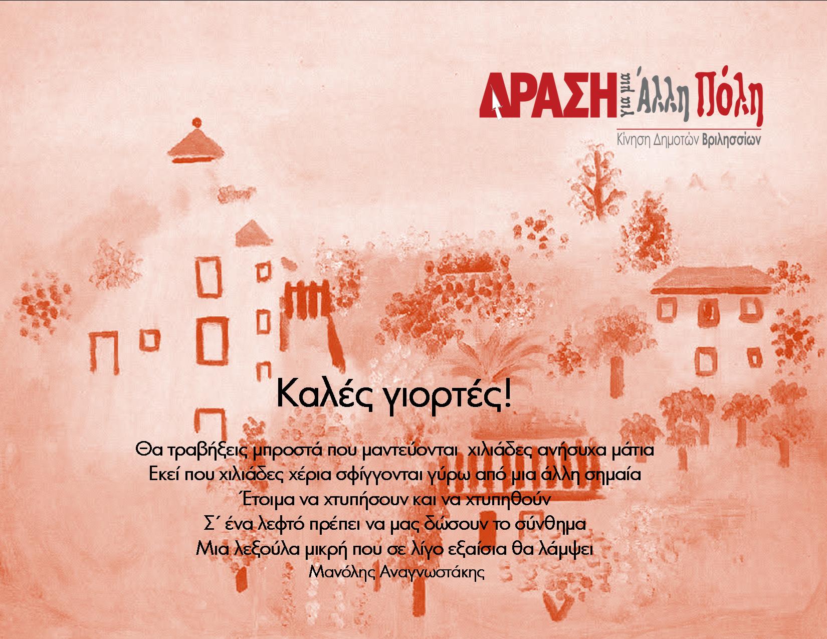 Το νέο μας στέκι, στην οδό Πάρνηθος 21, είναι πλέον γεγονός. Και είχαμε κάθε λόγο να το γιορτάσουμε. Όπως κάνουμε πάντα εμείς στην "Δράση για μια Άλλη Πόλη". Με φίλους και γείτονες. Με μουσική, ποτό, κεράσματα και κυρίως με πολλή, πολλή συζήτηση επί παντός επιστητού. Και ήταν όλοι εκεί. Ο επίτιμος δήμαρχος της πόλης Νίκος Παπαδόπουλος, ο πρώην δήμαρχος Κώστας Ιωαννίδης, η αντιδήμαρχος Παιδείας και Εθελοντισμού Σοφία Χατζάρα, η δημοτική σύμβουλος Τόνια Μητσοτάκη, η πρώην δημοτική σύμβουλος και πρόεδρος του συλλόγου Ηπειρωτών Βριλησσίων Θάλεια Πορφύρη και δεκάδες συμπολίτες μας, κάποιους από αυτούς ξανασυναντήσαμε μετά από χρόνια! Πολλοί ήταν εκείνοι που συμμετείχαν κρατώντας ο καθένας στα χέρια τους τη δική του προσφορά. Άλλος σπιτικό γλυκό, άλλος φαγητό, άλλος ποτό! Όπως ακριβώς γίνεται στις φιλικές και οικογενειακές συγκεντρώσεις. Τους παρευρισκόμενους υποδέχτηκε με έναν εγκάρδιο χαιρετισμό ο επικεφαλής της Κίνησης Γιάννης Τσούτσιας, που ευχαρίστησε όλους όσοι τίμησαν την Κίνηση μας με την παρουσία τους και την στηρίζουν σε κάθε της δραστηριότητα. Οι παρόντες αφού περιηγήθηκαν στην Δανειστική Βιβλιοθήκη και Ταινιοθήκη της Δράσης αφοσιώθηκαν στα κεράσματα και απήλαυσαν την μουσική του συγκροτήματος Εκτός Ύλης. Το μουσικό σχήμα Εκτός Ύλης αποτελείται από μαθητές του Πρότυπου Μουσικού Γυμνασίου-Λυκείου Παλλήνης που μένουν στα Βριλήσσια και τη γύρω περιοχή και ασχολούνται κυρίως με την παραδοσιακή μουσική. Στη συνέχεια τη σκυτάλη πήρε ο κιθαρίστας και δάσκαλος μουσικής Γιώργος Καρτσωνάκης με μπαλάντες και ροκ τραγούδια. Τους ευχαριστούμε όλους για την ευγενική τους προσφορά. Κίνηση Δημοτών Βριλησσίων ΔΡΑΣΗ ΓΙΑ ΜΙΑ ΑΛΛΗ ΠΟΛΗ