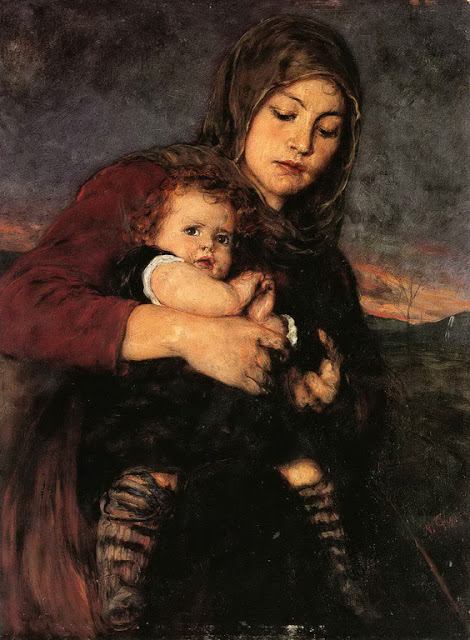 Οι δαίμονες ξεχύθηκαν μέσα στο κεφάλι της σαν όρνεα που οσμίζονται την πληγή. Γύρισε απαλά πλευρό να μην τον ανησυχήσει κι άφησε τα μάτια της να χαθούν στις ημέρες, που η Άνοιξη γέλαγε στην αγκαλιά της. Ίσως αν του ξαναμιλούσε, αν τον παρακαλούσε, αν... Μάταιος κόπος. Της το 'χε ξεκόψει. "Δεν θέλω κουβέντα, θα το ρίξεις το παιδί" Με τι ευκολία έμπηγε το μαχαίρι - Γεννημένος άραγε φονιάς; Με την ίδια ευκολία έβαψε τα χέρια του με το αίμα της νιότης, σκοτώνοντας το παιδί που ήταν κάποτε εκείνη. Το σκοτάδι πύκνωσε μέσα της κυριεύοντάς την. Γύρισε τρέμοντας και κοίταξε τα χέρια του, ήταν βαμμένα - πως δεν το 'χε προσέξει - ναι, τώρα το έβλεπε ξεκάθαρα, λερωμένα με το αίμα τόσων παιδιών. Βυθίστηκε σ' ένα βουβό, βαθύ κλάμα, σπάζοντας το γυάλινο πρόσωπό της σε λυγμούς. Τύλιξε τα χέρια της σφιχτά γύρω απ' την κοιλιά της, βάζοντας όλη την δύναμη του τρόμου της... " Όχι το παιδί μου, μακριά τα χέρια σου απ' το παιδί μου... " Μια κραυγή, έμεινε ασάλευτη να αιωρείται στο δωμάτιο κι έγινε η φωνή των παιδιών που ερμηνεύουν τον κόσμο. ΠΙΝΑΚΑΣ: Νικόλαος Γύζης (1842-1901), μάνα με παιδί. ΧΡΗΣΤΟΣ Ι. ΒΑΤΟΥΣΙΟΣ