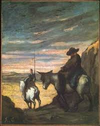 Ε, ο Έρωντας κι ο Θάνατος ήσαν τυφλοί, αόμματοι που λένε από γεννησιμιού τους, κι έτσι στα ψαχουλευτά μας έβρισκαν μεσ' τα σκοτάδια, κι έπαιζαν και χαίρονταν και γελούσαν σα δίδυμα αδέρφια που ' νταν, για το ποιος θ' αρπάξει τους πιο πολλούς. Όποιος γλίστραγε του ενός, μάγκωνε στον άλλον, κι έτσι εγύριζε ο τροχός της φύσης, και δώστου ξανά μανά να πιάσομε το Μάη, τον Οχτώβρη, το Γενάρη και πάει λέγοντας. Μα τα φερε δόλιος άνεμος και πιάσαν τα μαχαίρια, και σαν αδέρφια χόλωσαν, ποιος να βγάλει πιο βαθιά το μάτι τ' άλλου. Χτύπαγε ο ένας μια, κι αντιγύριζε ο άλλος. Χτύπαγε δυο, και λαβώνονταν ο ίδιος απ' τις μαχαιριές του. Ποτάμια χύνονταν το αίμα, έβαψαν οι λίμνες κι οι κάμποι, σείστηκε όλος ο ντουνιάς απ' το κακό τους. Κι απάνω π' αποσώνανε και σπούσαν οι λεπίδες, γιομίζοντας αστράλια το στερέωμα, κατέβηκε η μοίρα και τους εχώρισε, λέγοντας του ενός. "Εσύ, όταν θα βλογάς, ο άλλος θ' αποκοιμιέται, κι o άλλος σα φυσάει εσύ θ' αποξυπνάς." "Δώσετε τώρα τα χέρια, γιατί το αίμα δε χωρίζει, μόνο σταλάζει στην ίδια θάλασσα που κάποτε όλοι κολυμπούμε." ΧΡΗΣΤΟΣ Ι. ΒΑΤΟΥΣΙΟΣ ΠΙΝΑΚΑΣ: Honoré Daumier, O Δον Κιχώτης και ο Σάντσο Πάντσα. 1865.